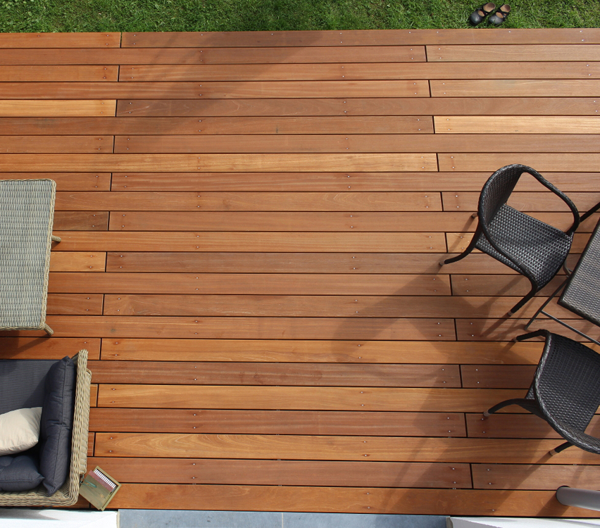 Für eine langfristig stabile Konstruktion ist eine fachgerechte Montage entscheidend. Bangkirai Terrassendielen sollten auf einer tragfähigen, gut hinterlüfteten Unterkonstruktion aus geeignetem Holz (wir bieten Bangkirai UK Holz auch mit an auf Naturholz.de) oder Aluminium verlegt werden. Ausreichende Fugenabstände ermöglichen den natürlichen Feuchtigkeitsaustausch und unterstützen die Trocknung nach Niederschlägen. Die Befestigung erfolgt in der Regel mit korrosionsbeständigen Edelstahlschrauben. Ein Vorbohren der Schraublöcher kann dabei helfen, Spannungsrisse zu vermeiden.